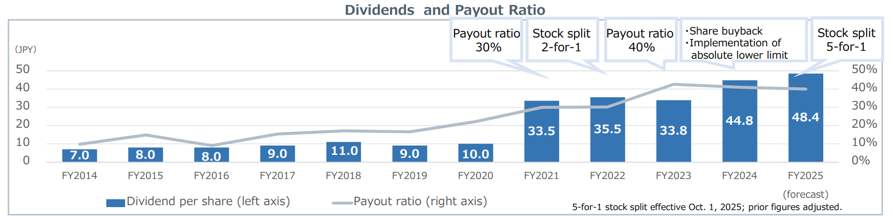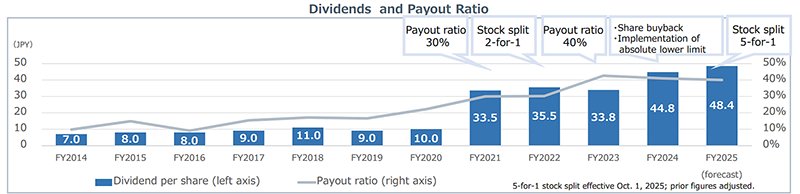 Our basic dividend policy is to provide stable dividends over the long term while maintaining an optimal balance between equity capital and shareholder returns. In connection with the large-scale investments currently underway in overseas mine development, the Company will maintain a consolidated dividend payout ratio of 40%, balancing financial soundness with shareholder returns. Furthermore, taking into account uncertainties in the business environment, including fluctuations in commodity prices such as copper and foreign exchange rates, the Company has decided to introduce an absolute lower limit that will not be affected by single-year results, thereby ensuring long-term, stable dividend payments.