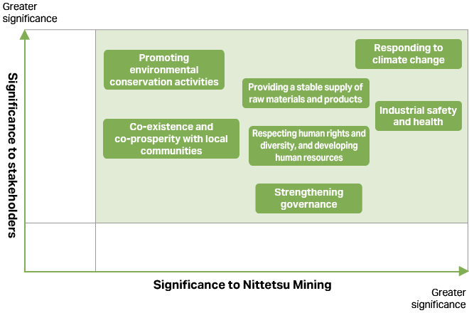 We referred to the GRI Standards to identify environmental, social, and economic issues in mining, our main line of business. Then, we carefully considered our mission, the characteristics of our business, our strategies, and what our stakeholders and the rest of society need from us. We created a materiality map and double-checked the significance of each item using models such as the SDGs wedding cake, which depicts the environment as the foundation of social and economic activities. Finally, we arrived at our list of material issues.