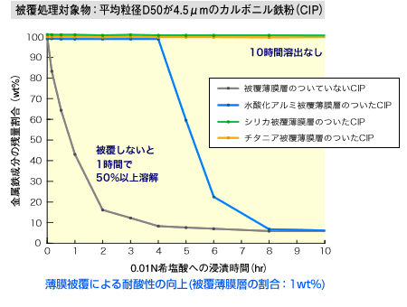 酸や加熱によって容易に溶解、酸化や相変化してしまう粒子に、ナノストラータを被覆すると、優れた耐酸性、耐酸化性や耐熱性を示します。この性質は膜が平滑かつ緻密であってはじめて現れる効果です。